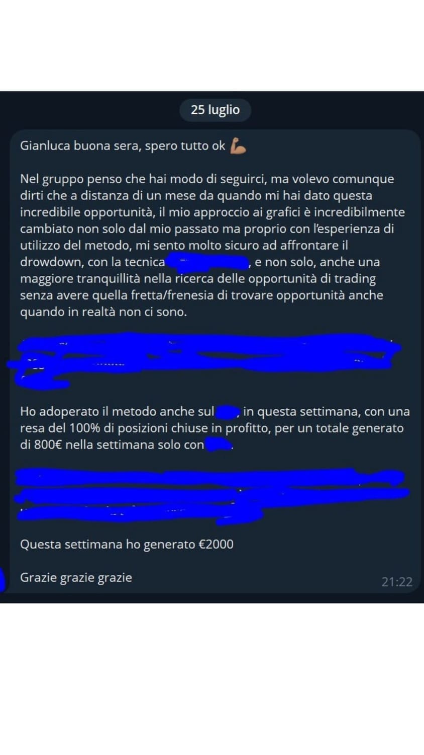 Finalmente puoi fare trading con lucidità, sicurezza e metodo, iniziando a generare profitti con costanza e regolarità, eliminando definitivamente l’emotività.
